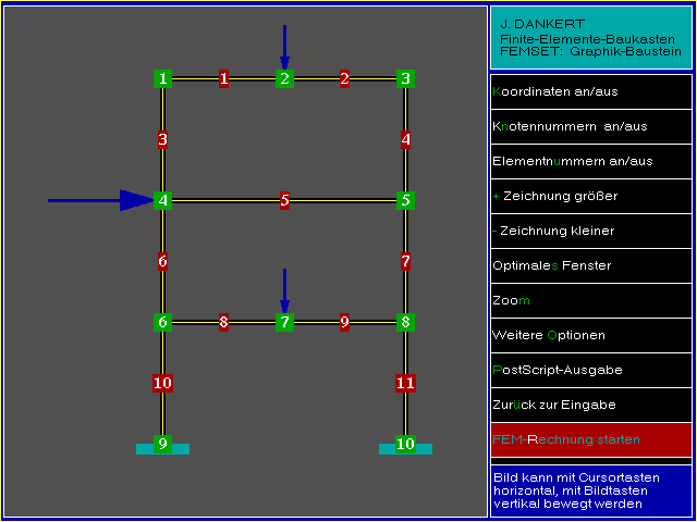 Danach ist das Eingabemodell komplett, im Eingabe/Korrektur-Menü kann “FEM-Rechnung starten” gewählt werden, danach sollte der Bildschirm folgendermaßen aussehen: