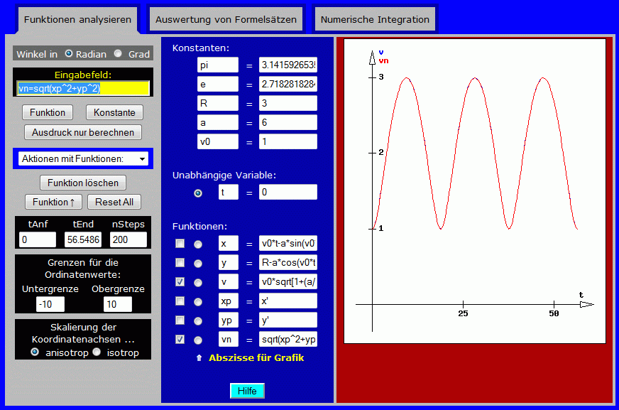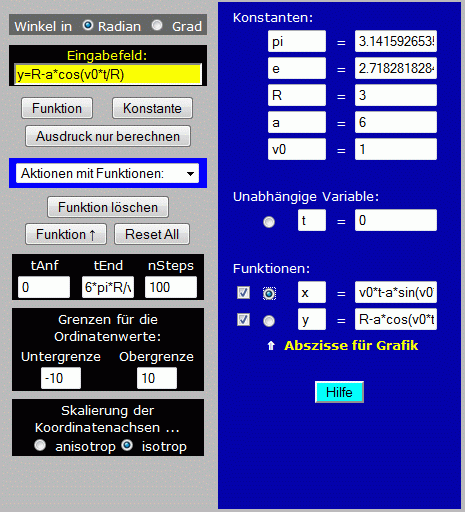 x=v0*t-a*sin(v0*t/R), abgeschlossen wird eine Funktionseingabe mit <Return> oder